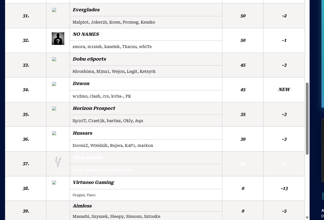| 38. | ![]() | Astra ESPORTS | 0 | +1 |