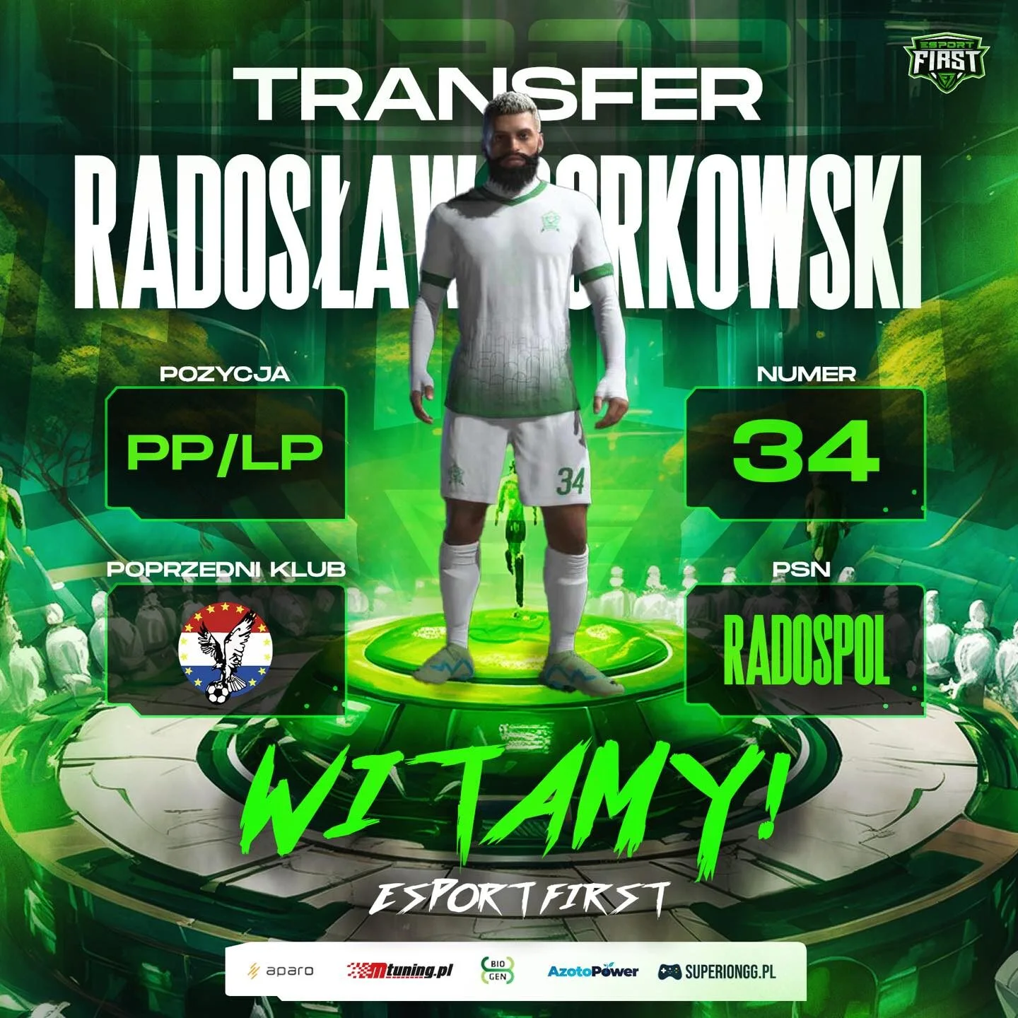 That's not all good news for Esport First's fans, because the organisation announced another new transfer. New player of Esport First now is Radosław „RADOSPOL” Borkowski. . Recently he represented Sokół Ostróda, now his new color is green. He will play with number 34, his preferred positions is left midfielder or right midfielder.