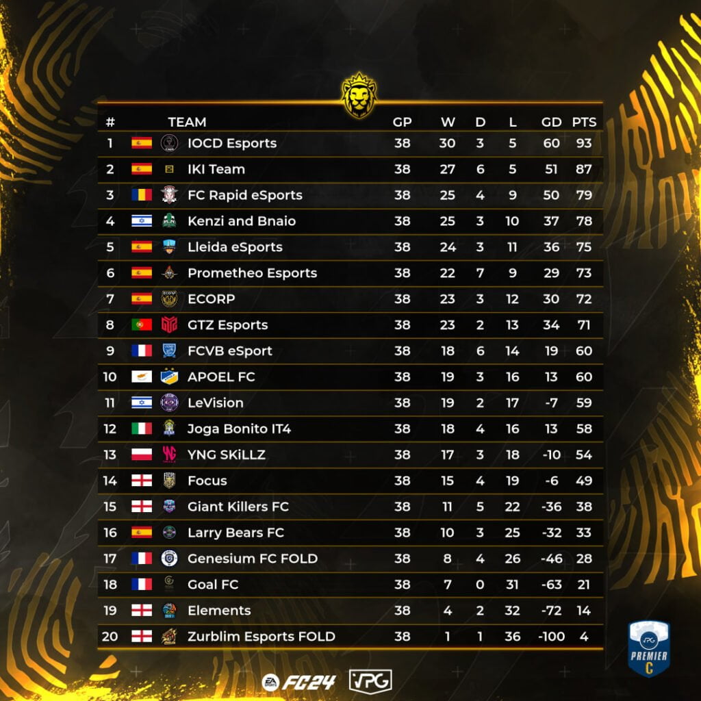 | 38. | Virtuoso Gaming | 0 | -13 |