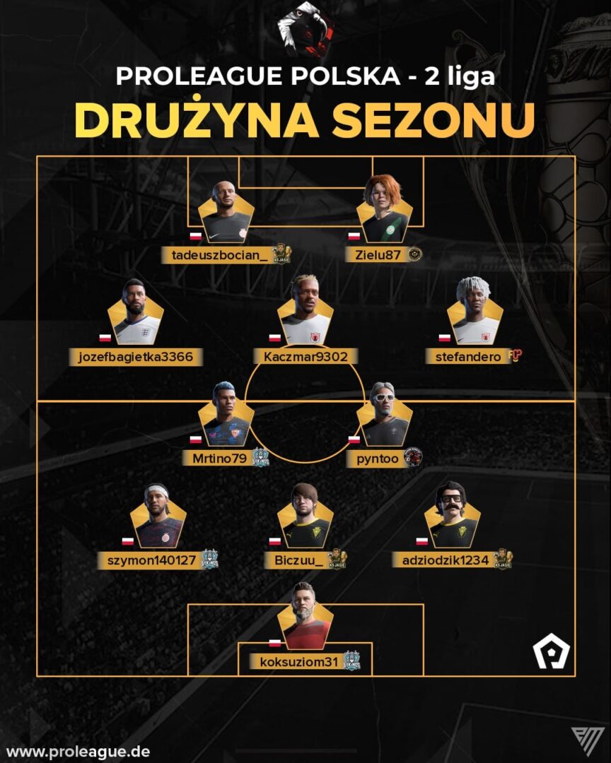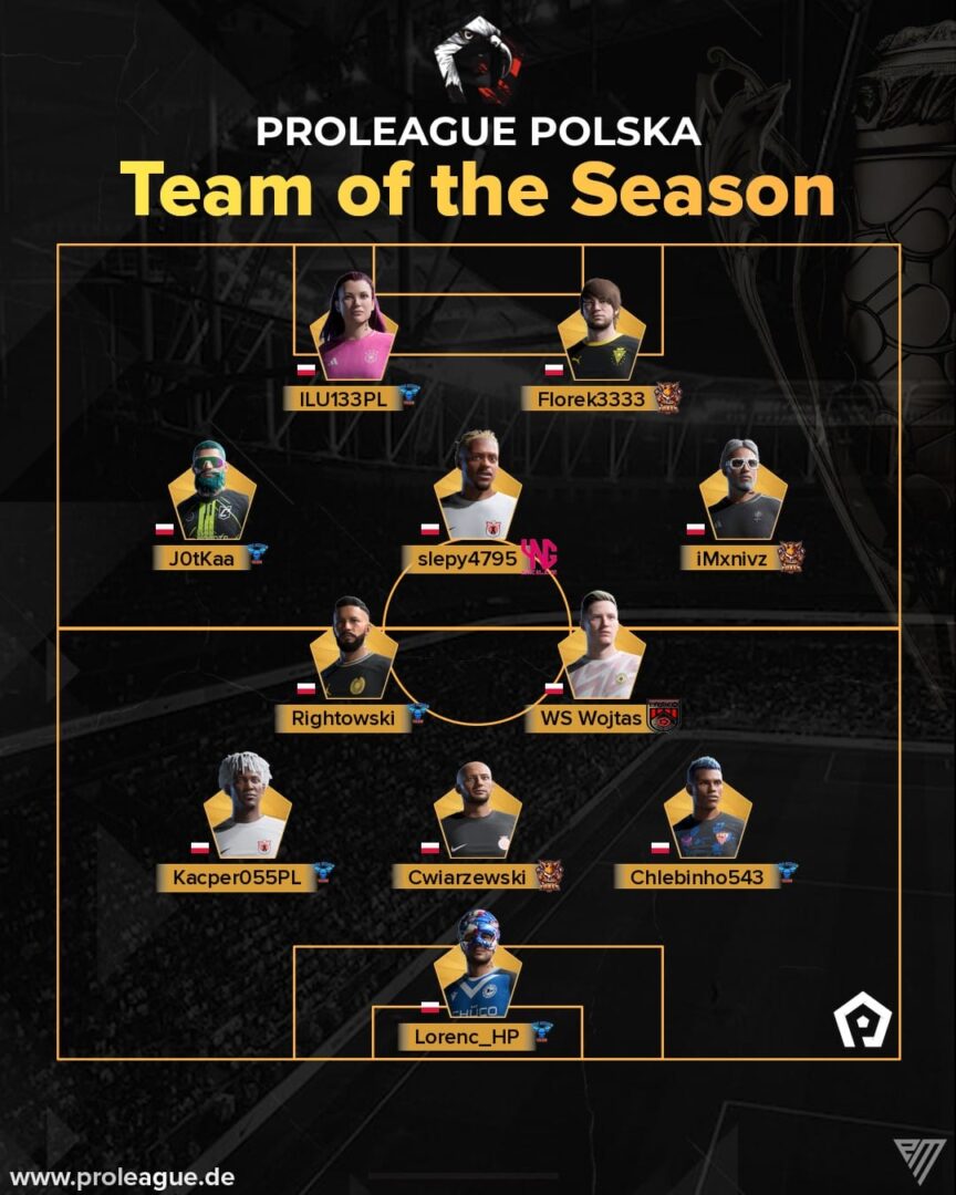 Przypomnijmy, YNG SKiLLZ zakończyło rozgrywki ProLeague Polska (1. liga) w środku tabeli, a jeden zawodnik został nawet wyróżniony w drużynie sezonu tej struktury. Mowa tutaj o „slepy4795”, który zdecydowanie nie jest ślepy, inaczej by nie trafił do tej drużyny. Zawodnik występuje na co dzień na pozycji środkowego pomocnika ofensywnego (chyba). Gratulujemy!